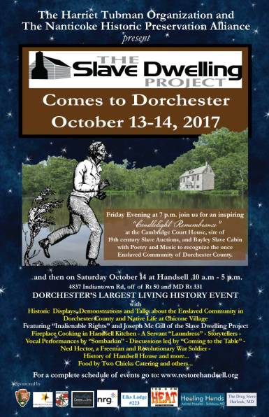 In celebration of Dorchester County’s rich African American heritage, the “Slave Dwelling Project Comes to Dorchester” brought attention to vernacular structures associated with this history including extant vernacular structures that served as dwelling houses, churches or other cultural and utilitarian uses in the lives of African Americans and well as provided an opportunity to “provide leadership, resources, and a supportive environment for all who wish to acknowledge and heal wounds from racism that is rooted in the United States’ history of slavery”. This project featured Joseph McGill of the SlaveDwellingProject.org who stayed one night in the Handsell Slave Chamber in Vienna and one night at the Bayly House Slave Cabin in Cambridge and discussions were led by Coming to the Table organization.